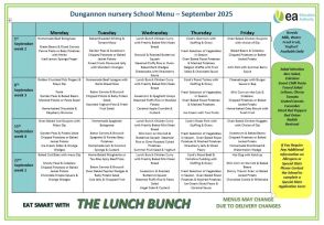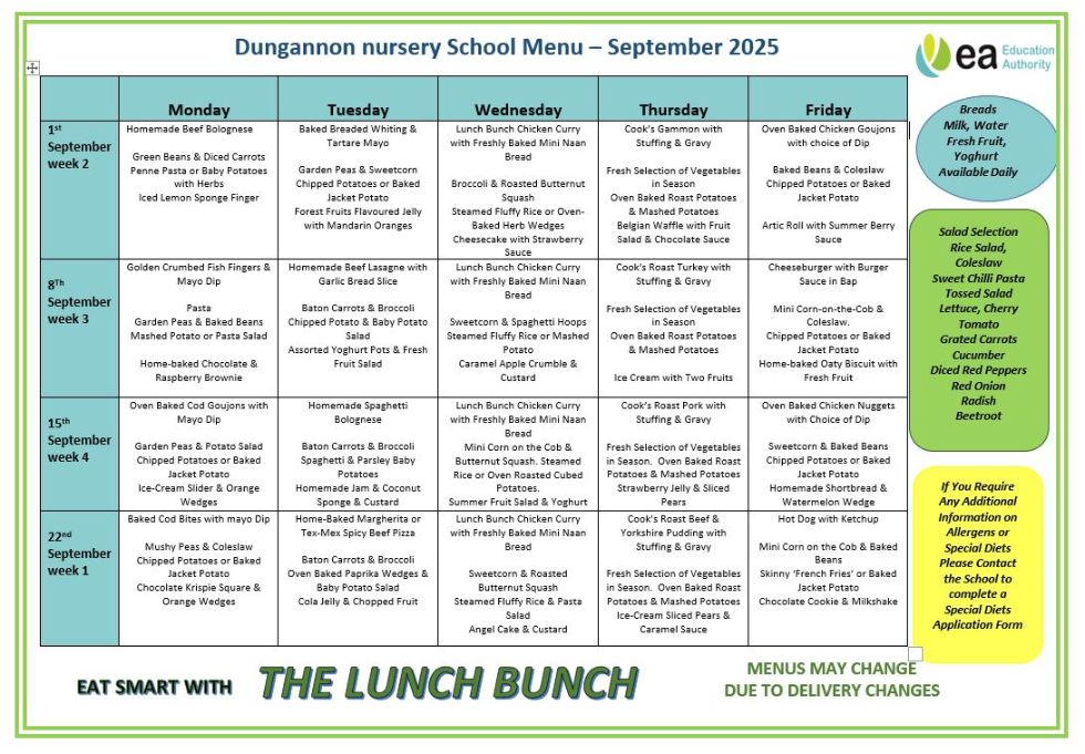 The nursery children really enjoy their midday meal cooked by Dungannon Primary School. They are always really hungry after a busy morning hard at work! We eat together in small groups of 6-8 children with a member of staff. The children set their own places with their knife, fork and spoon; they pour their own drinks and they help serve their own food and help tidy away their dishes and cutlery.